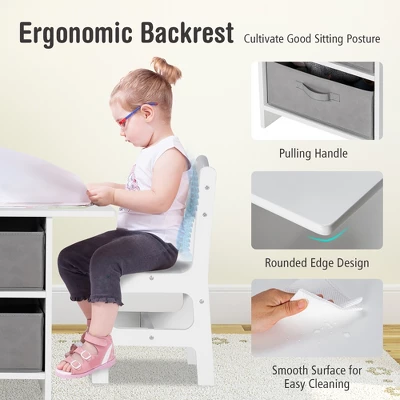 - Kid-friendly Design: The activity desk set has smooth edges and rounded-off corners to keep your children from scratching and bumping. The chairs are built at an ergonomic height for kids to sit in right positions. Whatās more, the backrests are slightly tilted to better fit kidās body and provide a comfortable sitting experience.