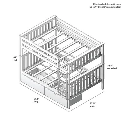 Plenty of room for sleep and play? Now thatâs a win-win! The Max & Lily Full Over Full Bunk Bed with Storage Drawers is the perfect combination of functional and fun that both kids and parents love. Top bunk features tall 14â guardrails, so the bed safely fits standard mattress sizes. Storage drawers make organizing a breeze. Angled ladder with rounded edges offers comfortable, easy climbing. Added bonus – ladder is both reversible and removable, so it is flexible to work with any space. Solid, knot-free New Zealand pine wood adds strength and stability. All Max & Lily products use a durable, low VOC finish. The slatted head and footboards and flush, color-matched hardware give this bunk bed a clean, modern look. Instructions, upper/lower slat rolls, and required hardware are included. With solid plywood slats and a metal support bar for the top bunk, each sleeping surface can support 400 pounds of resting weight. This bed meets or exceeds Federal safety standards for kids furniture. When itâs time for play, this bunk bedâs space saving design frees up plenty of floor space by stacking two sleeping surfaces. 2+ adults make assembly simple and easy. The Full Over Full Bunk Bed with Storage Drawers from Max & Lily offers exceptional quality and affordability that kids and their parents will enjoy for years to come. Max & Lily is a member of the Maxwood family of brands – the kids furniture experts bringing a tradition of superior quality, safety and fun!