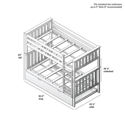 Plenty of room for sleep and play? Now thatās a win-win! The Max & Lily Twin Over Twin Bunk Bed with Trundle is the perfect combination of functional and fun that both kids and parents love. Top bunk features tall 14ā guardrails, so the bed safely fits standard mattress sizes. Angled ladder with rounded edges offers comfortable, easy climbing. Added bonus – ladder is both reversible and removable, so it is flexible to work with any space. Solid, knot-free New Zealand pine wood adds strength and stability. All Max & Lily products use a durable, low VOC finish. The slatted head and footboards and flush, color-matched hardware give this bunk bed a clean, modern look. Instructions, upper/lower slat rolls, and required hardware are included. With solid plywood slats and a metal support bar for the top bunk, each sleeping surface can support 400 pounds of resting weight. A super functional trundle makes it perfect for sleepovers. 2+ adults make assembly simple and easy. This bed meets or exceeds Federal safety standards for kids furniture. When itās time for play, this bunk bedās space saving design frees up plenty of floor space by stacking two sleeping surfaces. The Twin Over Twin Bunk Bed with Trundle from Max & Lily offers exceptional quality and affordability that kids and their parents will enjoy for years to come. Max & Lily is a member of the Maxwood family of brands – the kids furniture experts bringing a tradition of superior quality, safety and fun!