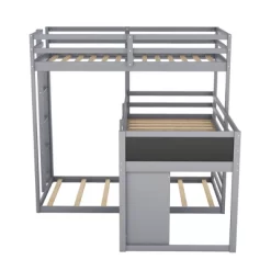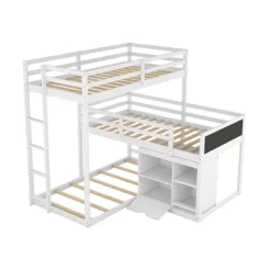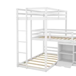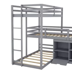 Modern and transitional, this L-shaped triple bunk bed has the space-saving functionality you are looking for to maximize your bedroom. This triple bed is built with a wood frame that includes an integrated ladder, full-length guardrails, and secured metal slats to ensure that you will sleep in complete security and stability. What’s more, you don’t need to purchase any additional box springs or foundations.