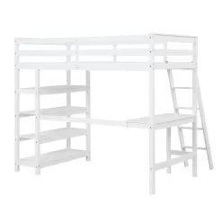 The loft bed combines bedroom and study into a cozy and lovely space, below the upper bunk there are a built-in desk and crosswise shelves on the other end, which make kids do homework and get books and daily items from the 4-shelf storage stand very conveniently. The shelves stand also can display anything lovely and keep your bedroom neat and concise, making this loft bed show outstanding centerpieces in any bedroom. The inclined ladder on the upper bed adds plenty of fun and exercise to kids when they get up to bed, instantly the exquisite study is turned into a warm sleeping nest.