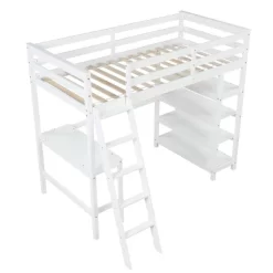 - [Comprehensive Design] The feature of this loft bed not only ensures better sturdy construction but also reduces safety concerns, the desk offering the kids a quiet, cozy place for reading and writing. In addition, the inclined ladder against the upper bunk is designed with a safe and wider width to provide more spacious steps and solid support, making it easier for you to climb up and down the ladder.